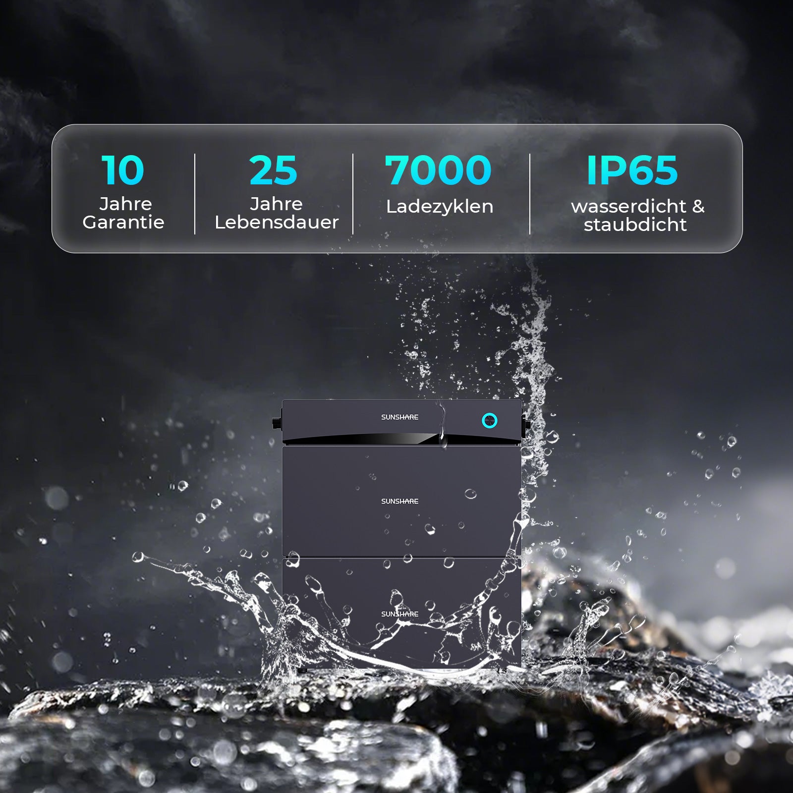2.Längere Lebensdauer: Feste Elektrolyte machen die Batterie nicht nur sicherer, sondern auch langlebiger. Die Sunshare Glory Speichereinheit erreicht eine Lebensdauer von bis zu 7000 Zyklen – 30% länger als traditionelle Lithium-Eisenphosphat-Batterien.