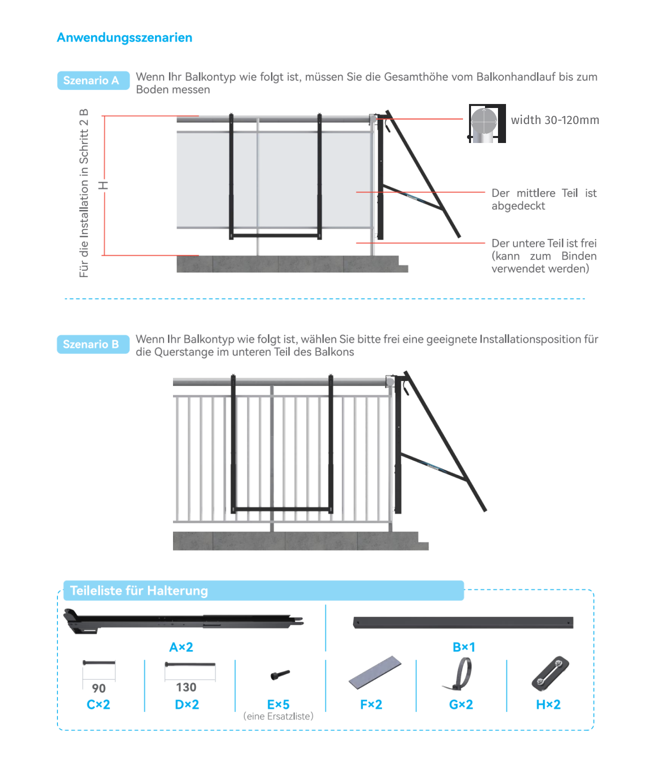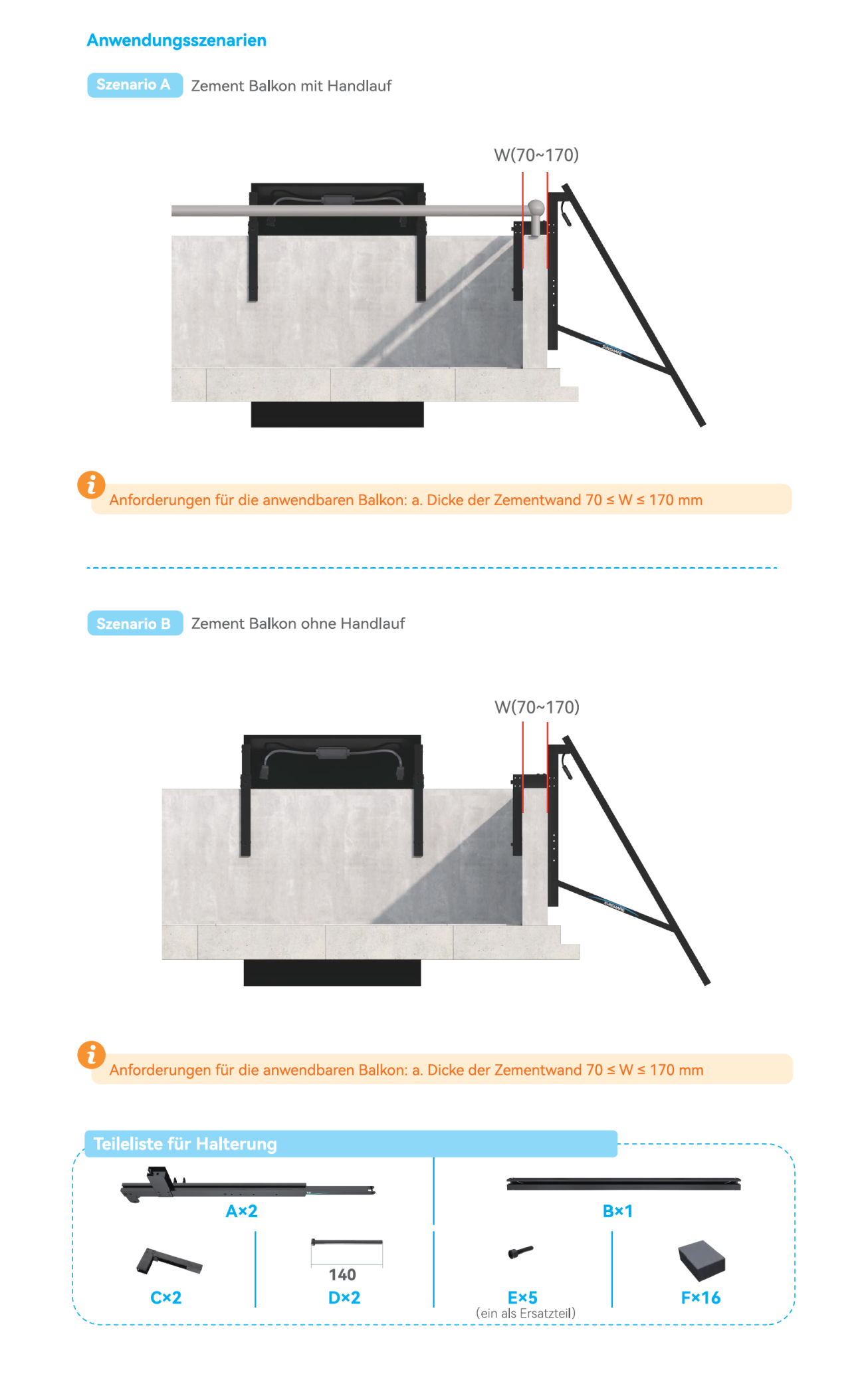 - Geeignet für Betonbalkone mit einer Brüstungsstärke zwischen 70 und 170 mm.