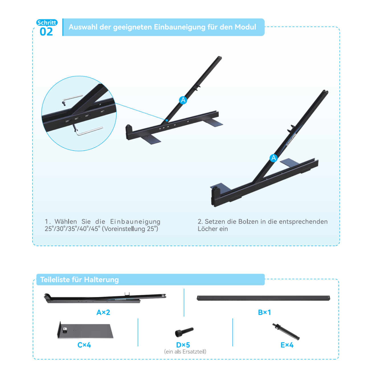 - Neigungswinkel von 10 ° bis 30 ° verstellbar, um eine optimale Ausrichtung und maximale Solarerträge zu gewährleisten.