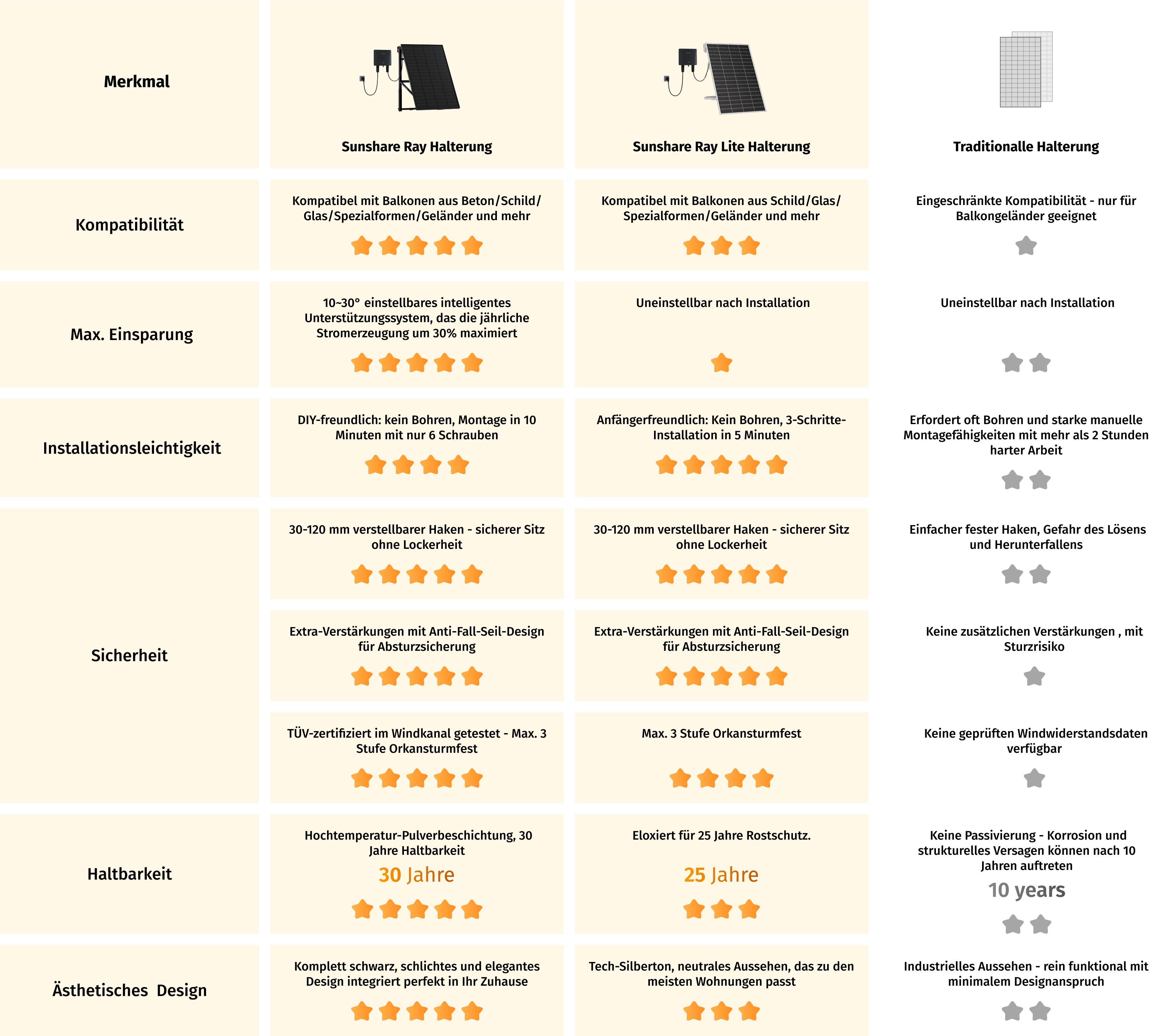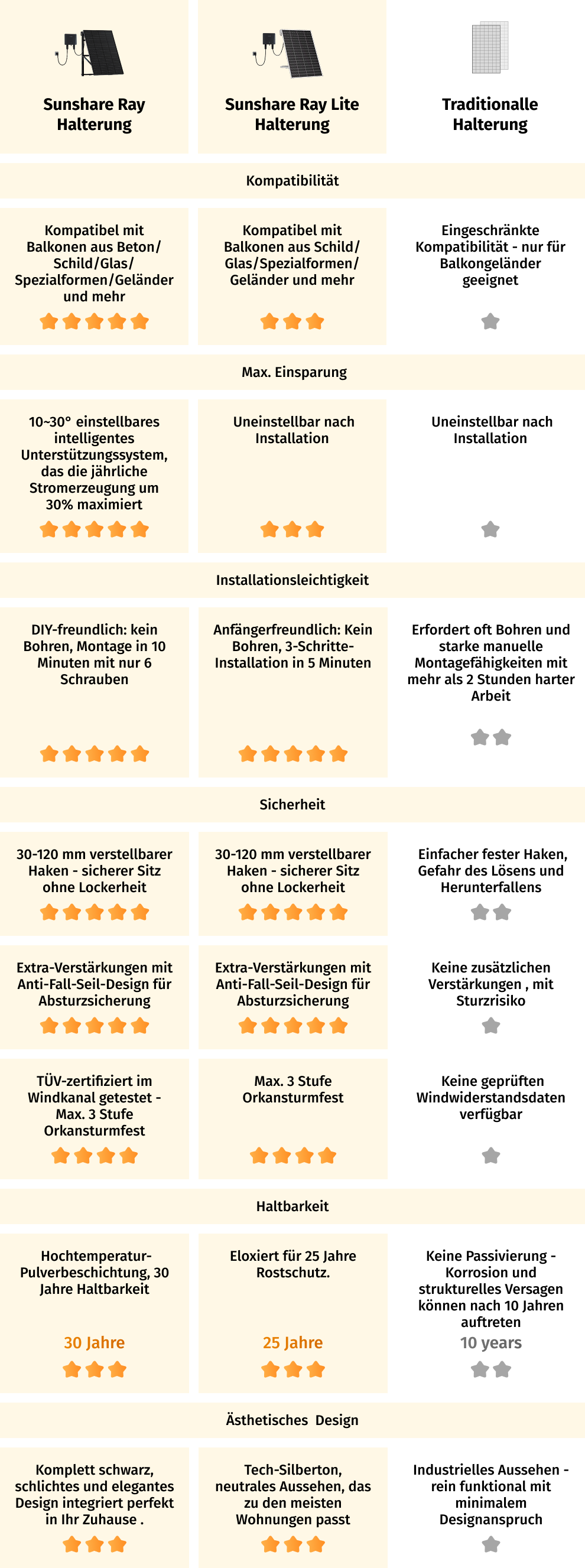 Ideal für Balkone mit festen Seitenwänden. Die Halterung wird sicher befestigt, ganz ohne zu bohren. Der einstellbare Neigungswinkel von 10 bis 30 Grad sorgt dafür, dass du immer das Beste aus der Sonne herausholst. Einfach aufzubauen und effizient im Betrieb.