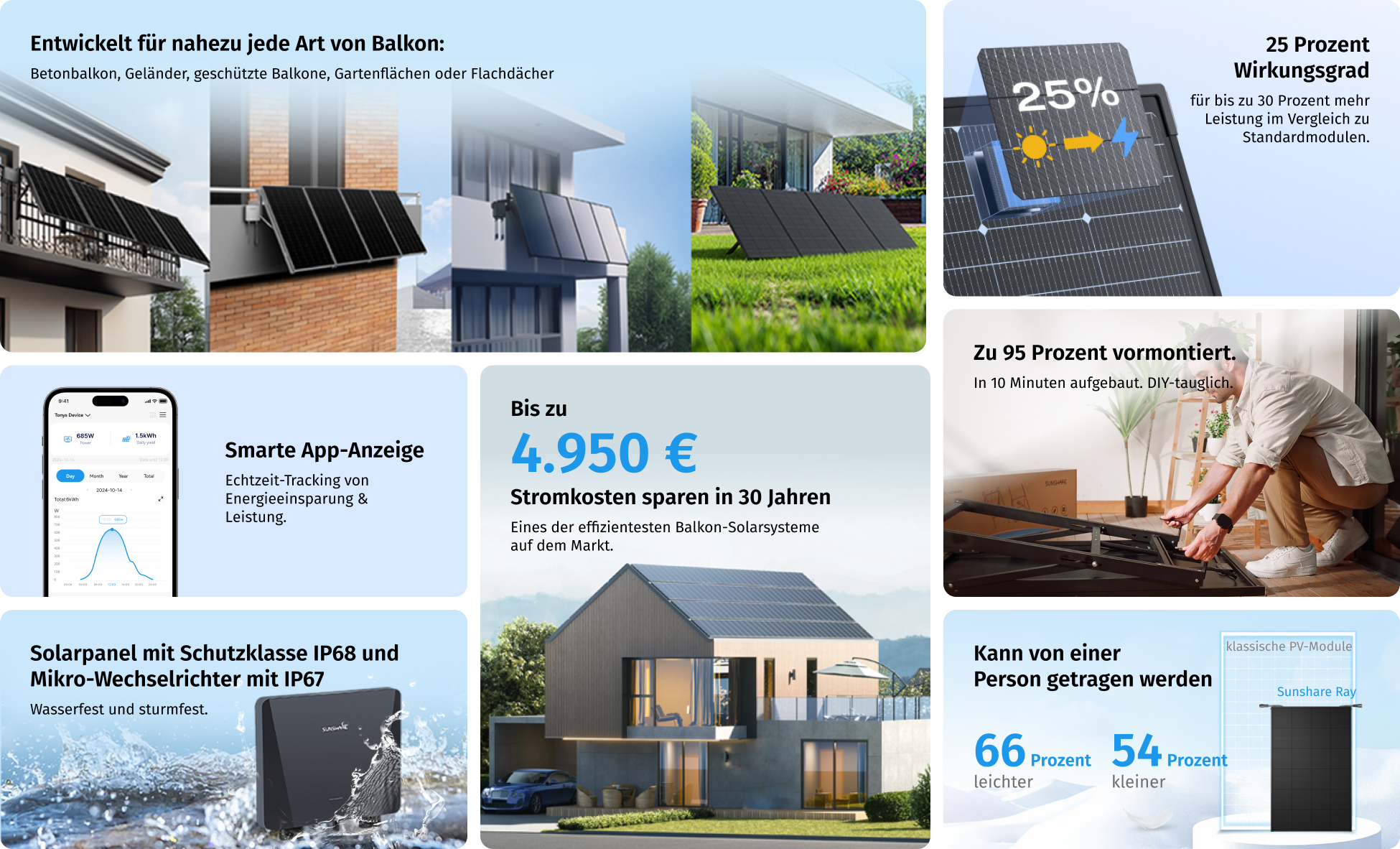Während andere Solarsysteme Bohren, Werkzeug und technisches Know-how verlangen, geht es mit Sunshare Ray ganz entspannt. Mit seinem Plug-and-Play-Design und 95 % vormontierten Teilen – inklusive Halterung, Modul und Wechselrichter – bist du sofort startklar. Kein Bohren, kein Fachwissen nötig. Einfach auspacken, aufstellen, einstecken – und in nur 10 Minuten Strom erzeugen.